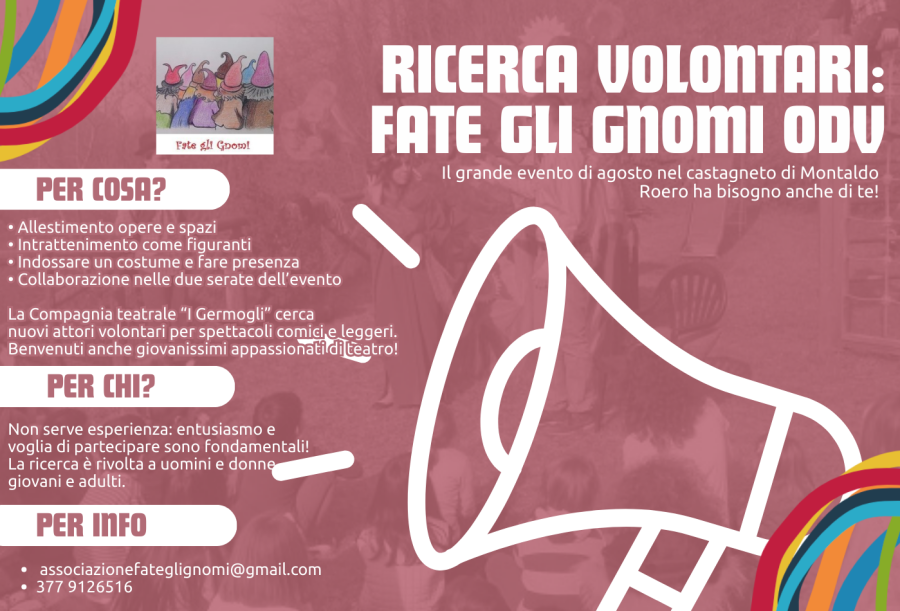 L’Associazione Fate Gli Gnomi ODV, da sempre impegnata nella valorizzazione del territorio, è alla ricerca di volontari per il grande evento di agosto “Il Bosco Fatato” (https://www.facebook.com/profile.php?id=100087170266415) nel castagneto di Montaldo Roero. In particolare, per due serate dell’evento, si ricercano volontari disponibili per: allestimento delle opere e degli spazi, intrattenimento figuranti, indossare un costume e fare presenza La ricerca è…