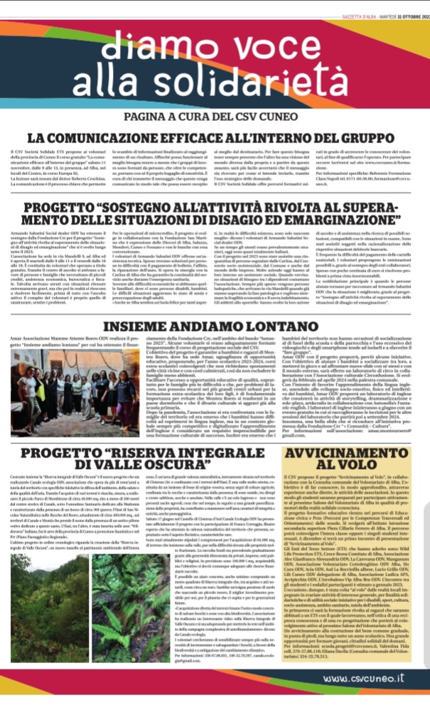 Gazzetta d'Alba31 ottobre 2023 >>> torna alla rassegna stampaservizio gratuito realizzato da società solidale - centro servizi per il volontariato della provincia di cuneo per promuovere il volontariato e la cultura della solidarietànnormativeaaagenda e appuntamentitatrova associazionefformazionebfbandi e finanziamentiwnewsiscriviti alla newsletter<<<<<<<<<<<<<<<<<