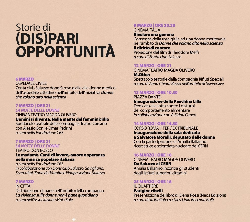 Riportiamo le iniziative realizzate dai comuni principali del territorio della Granda in occasione del mese di marzo. Gli appuntamenti sono organizzati per riflettere sul ruolo della donna nel segno della consapevolezza, della cultura e dell’impegno civile.